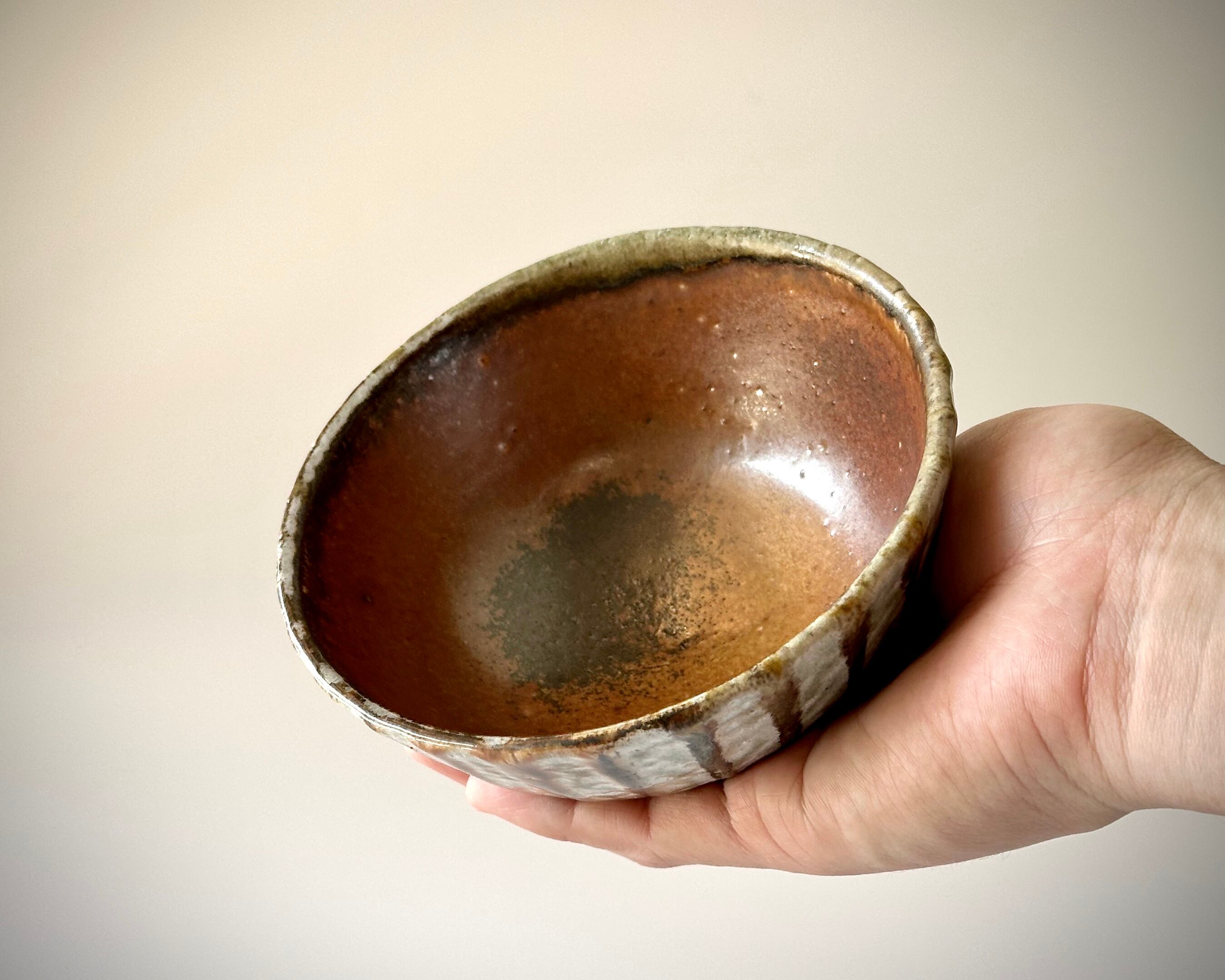 重曹を窯に直接投入して器面にソーダガラスを形成させるソーダ焼成。こちらの品は全体に炎がよく当たりはっきりとしたストライプが現れています。これは泥を掛けた直後に指で掻き落とすことで現れる模様です。