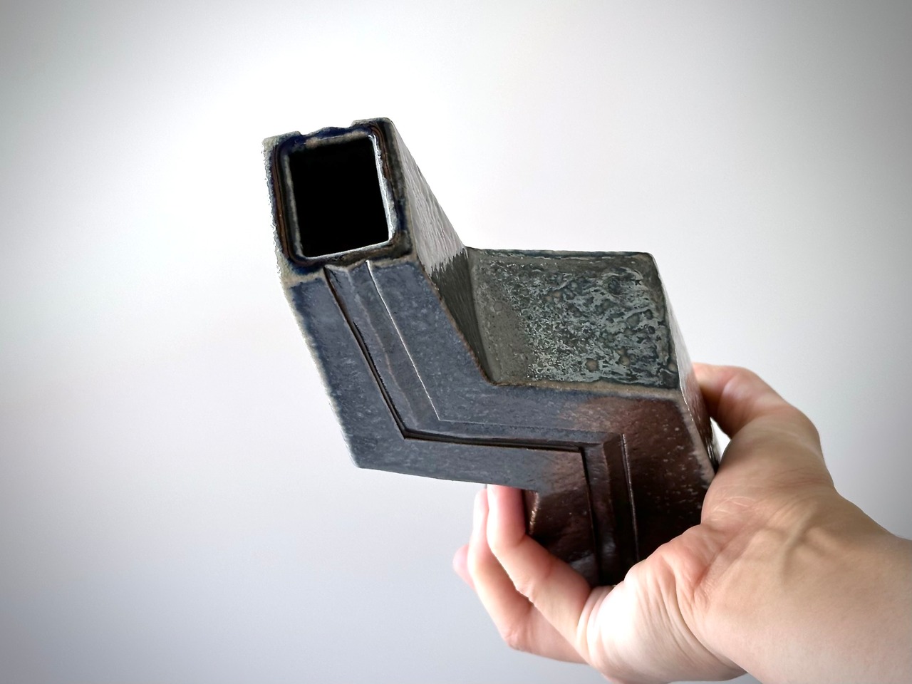 重曹を窯に直接投入して器面にソーダガラスを形成させるソーダ焼成。こちらの品は上部にのみソーダがかかったことにより、黒色メインのボディにほんのり青がのぞいています。形はイナヅマをモチーフにしました。いろんな向きで花を生けることを楽しんでいただければと思います。