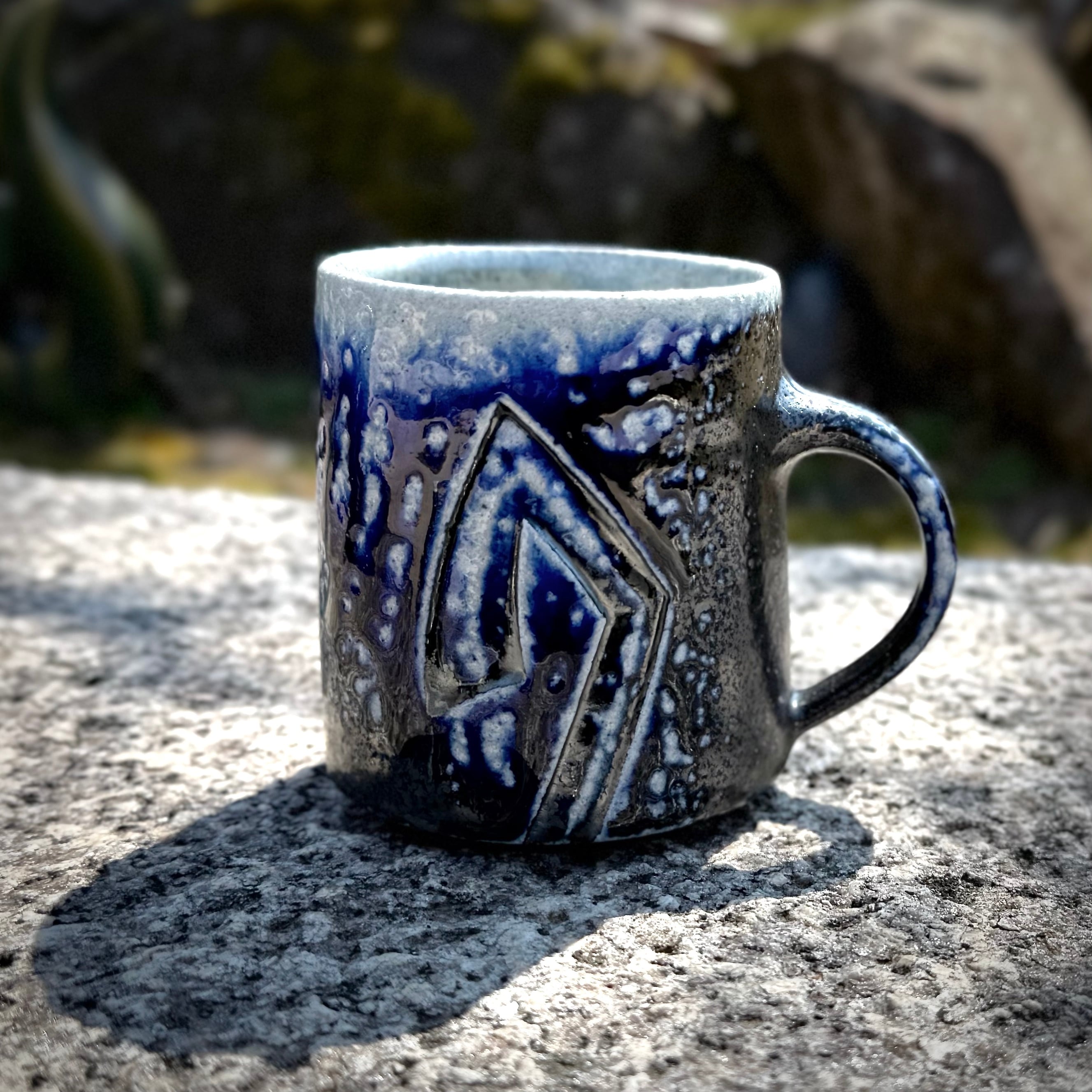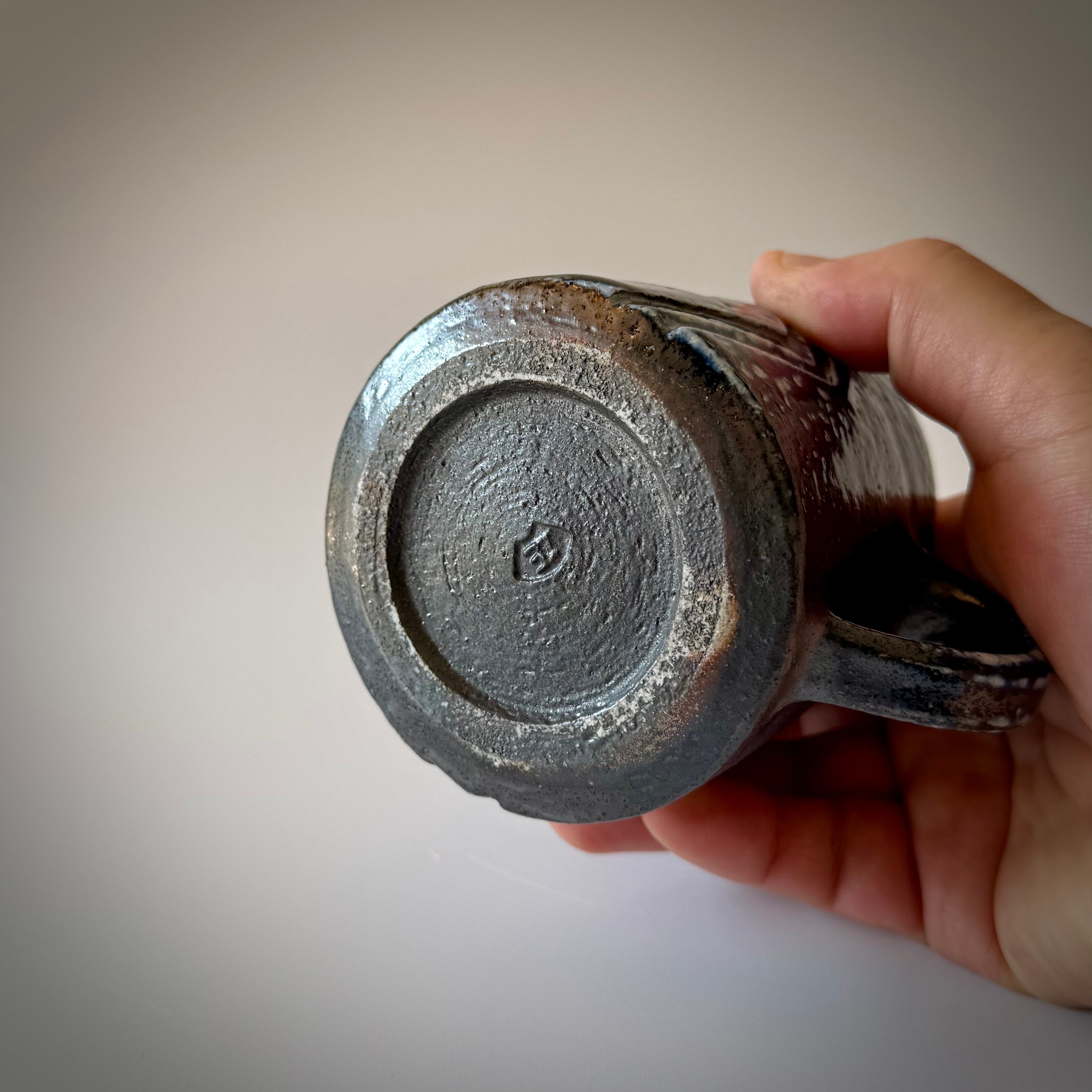 重曹を窯に直接投入して器面にソーダガラスを形成させるソーダ焼成。こちらの品はコバルトを含む呉須という顔料を塗り、そのまま窯に詰めたものです。炎がよく当たった箇所はつややかな釉が生じて明るい青、反対の影になった箇所は土味が残った黒。黒、青、白の色の変化が面白い景色となっています。斑点は重曹から発生するガスが抜ける際の名残となっており特徴の一つです。