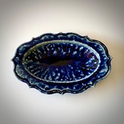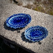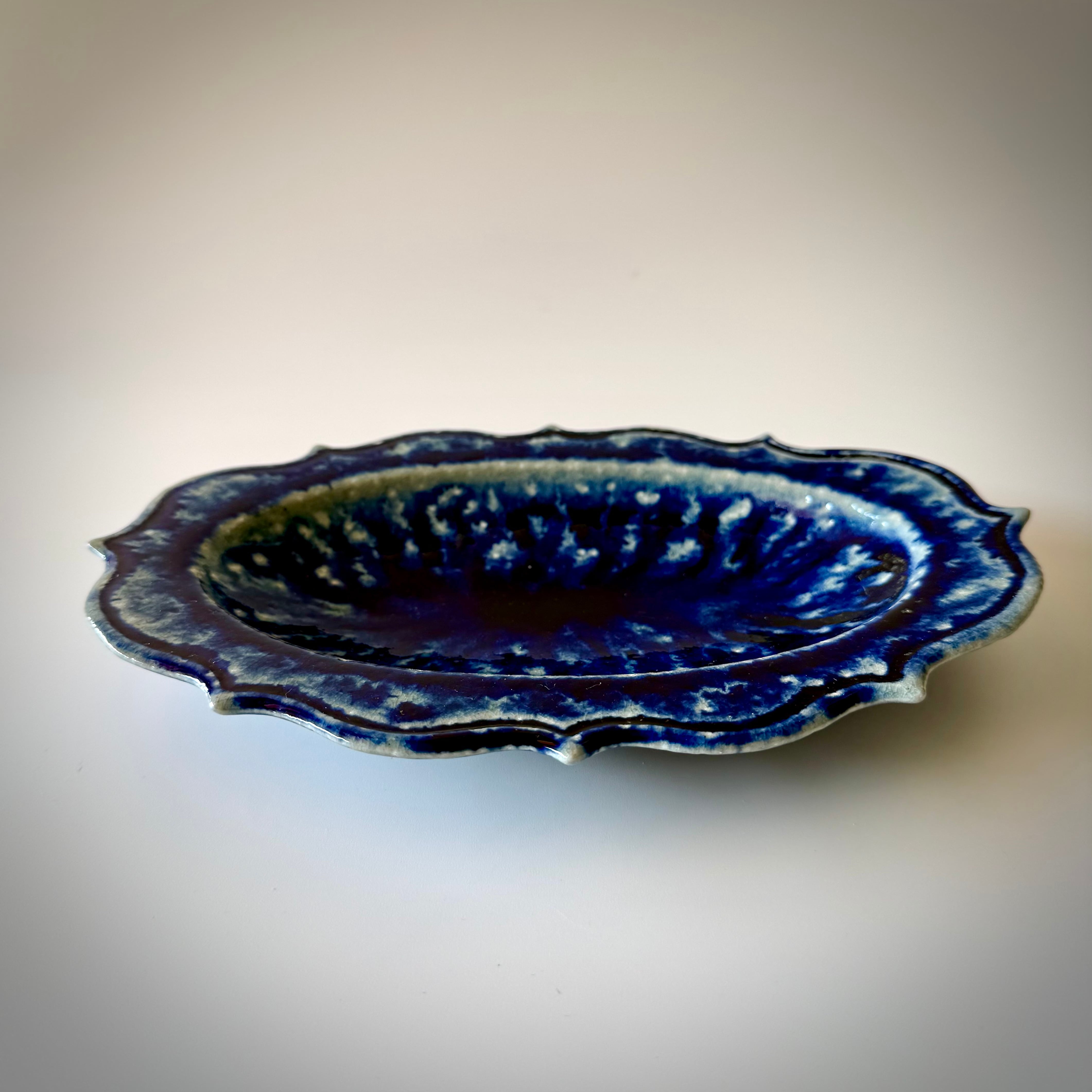 重曹を窯に直接投入して器面にソーダガラスを形成させるソーダ焼成。こちらの品はコバルトを含む呉須という顔料を塗り、そのまま窯に詰めたものです。全体的に炎がよく当たりつややかな釉が生じて明るい青が現れ、さらに温度を上げてその釉を流し中央に美しい青の釉だまりが生まれました。少し洋風の趣があり西洋料理に向いてるのはもちろんのこと、和食にもよく馴染んでくれます。