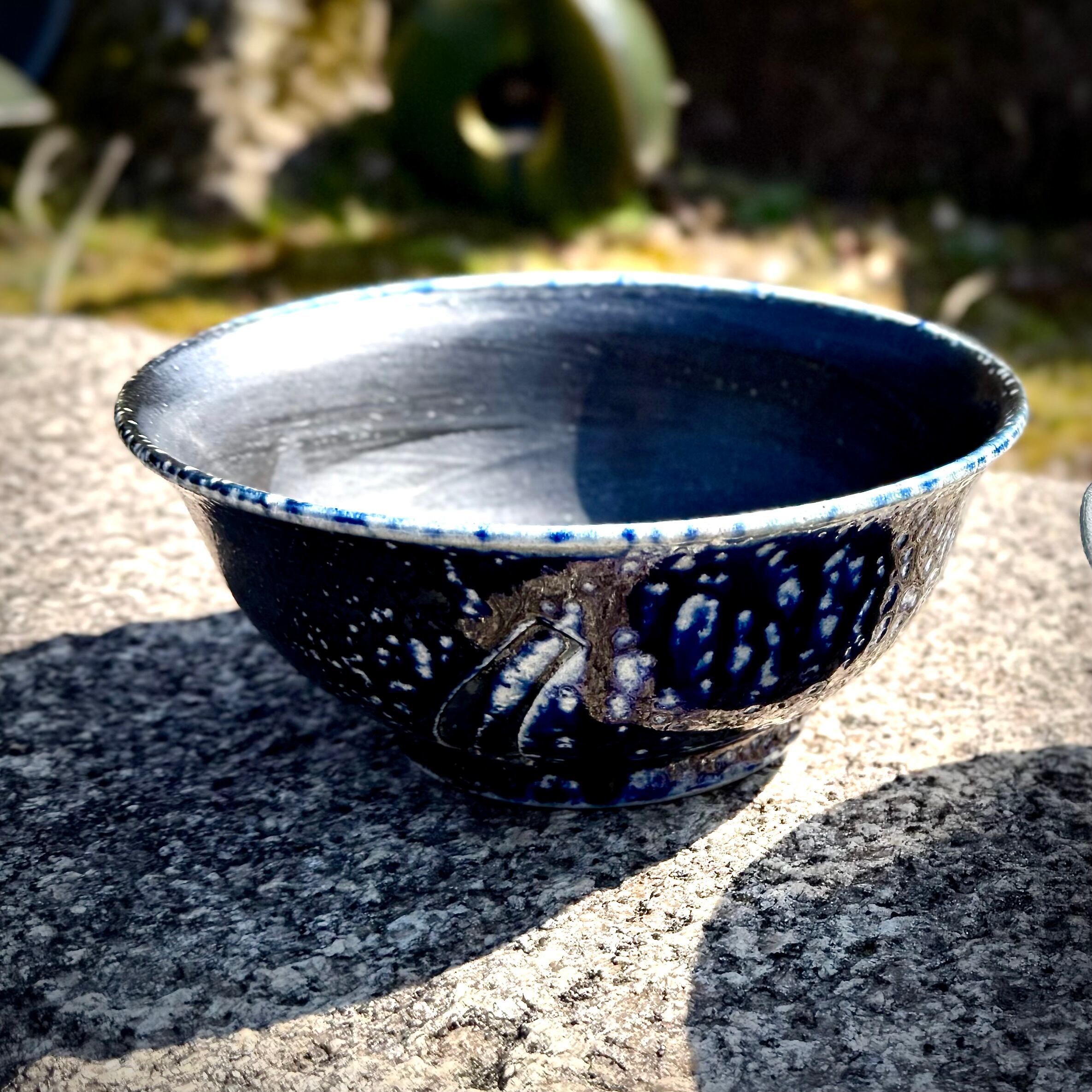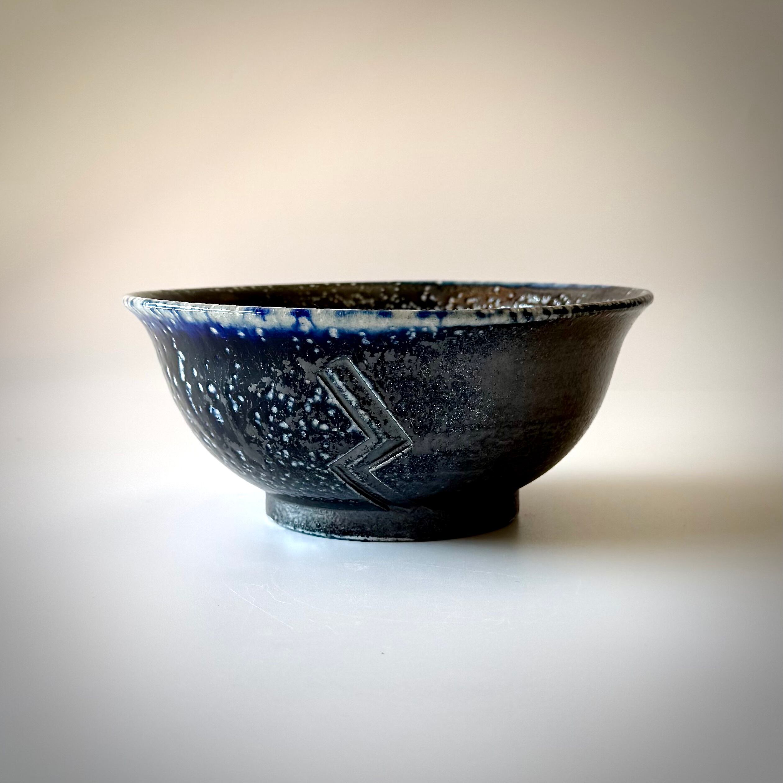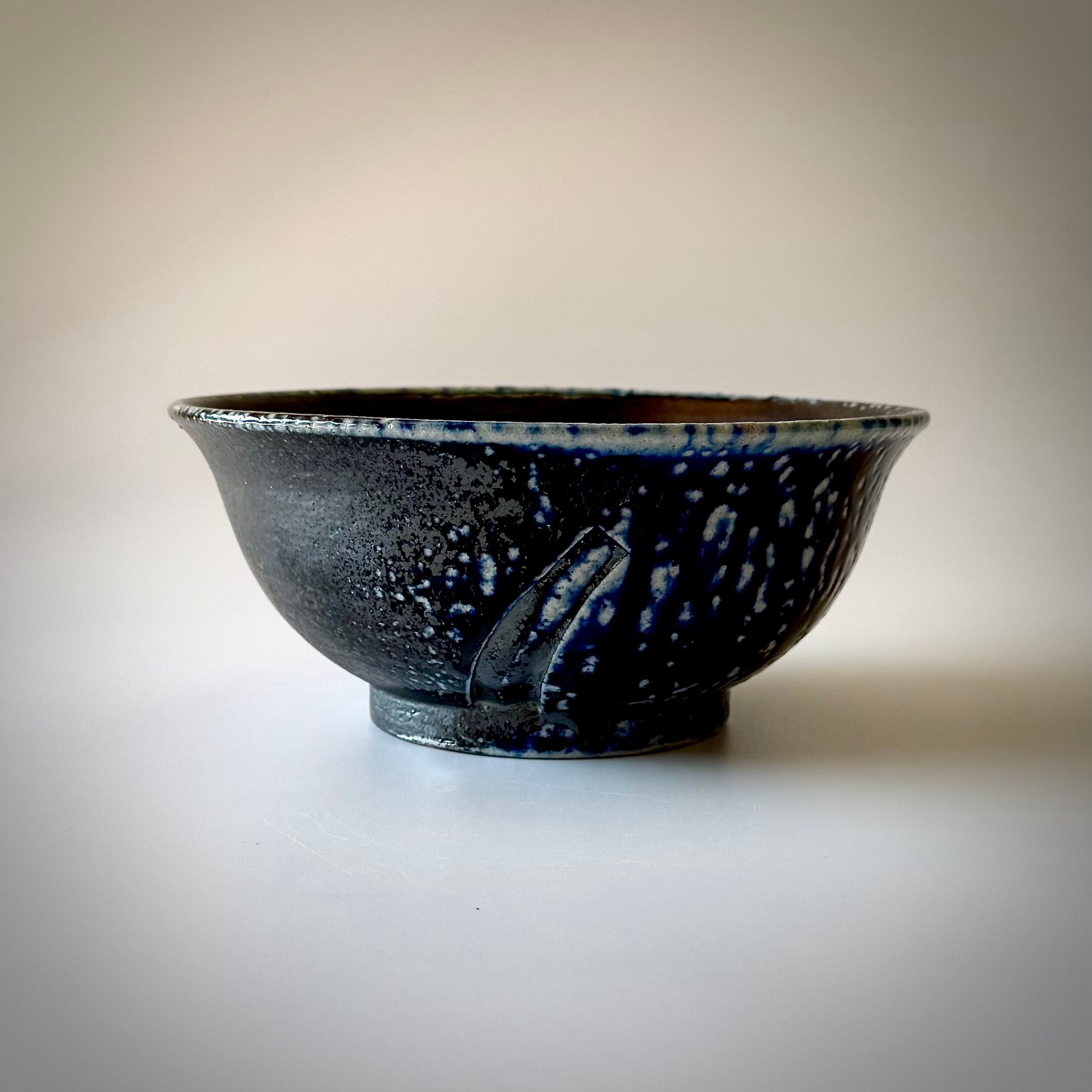 重曹を窯に直接投入して器面にソーダガラスを形成させるソーダ焼成。こちらの品はコバルトを含む呉須という顔料を塗り、そのまま窯に詰めたものです。炎がよく当たった外側はつややかな釉が生じて一部に明るい青、全体的に土味が残った黒が現れています。内側には刷毛目を施し黒の中に変化を狙いました。麺類用のどんぶりとしてはもちろん、黒が野菜の色を引き立てるのでサラダボウルとしても使い勝手が良いと思います。