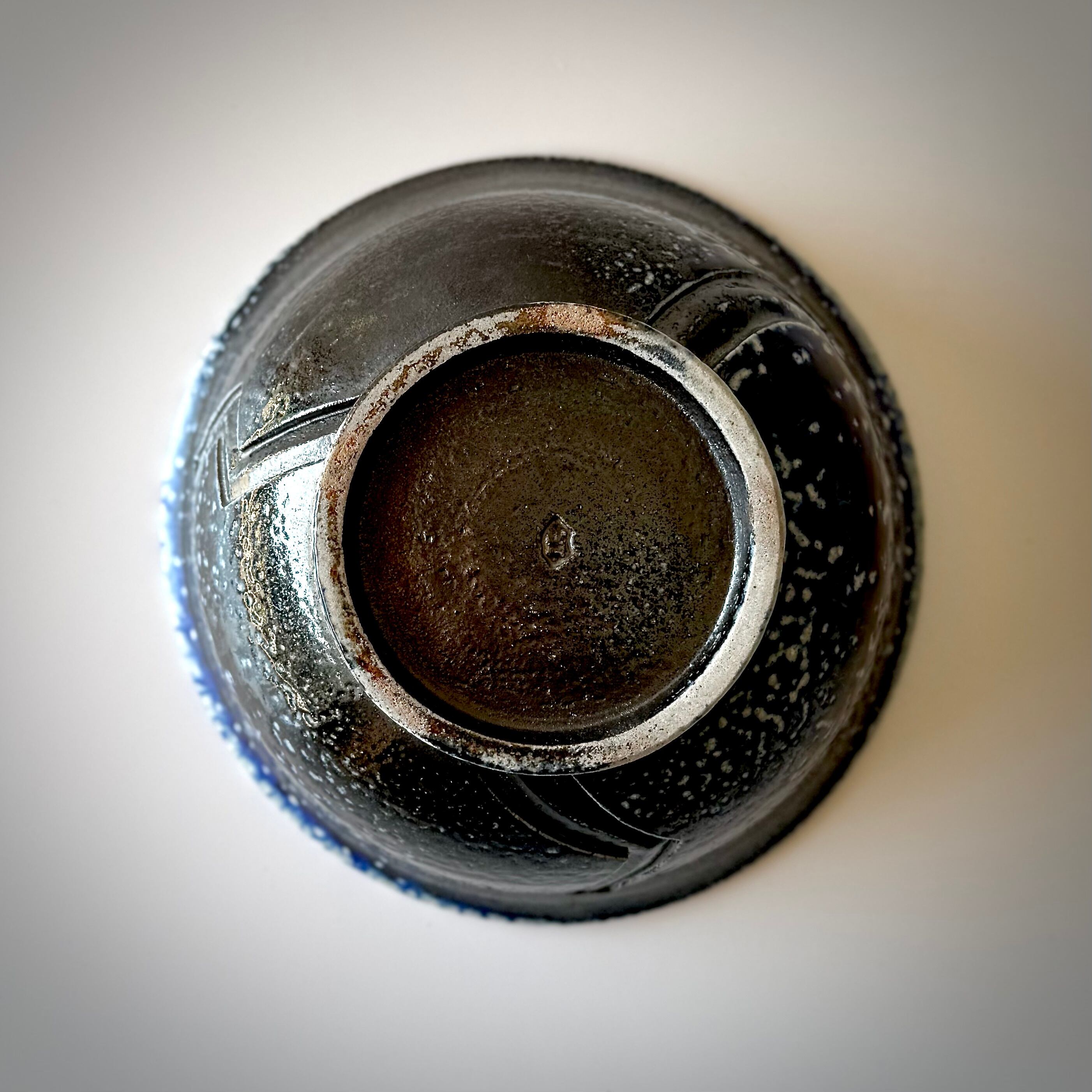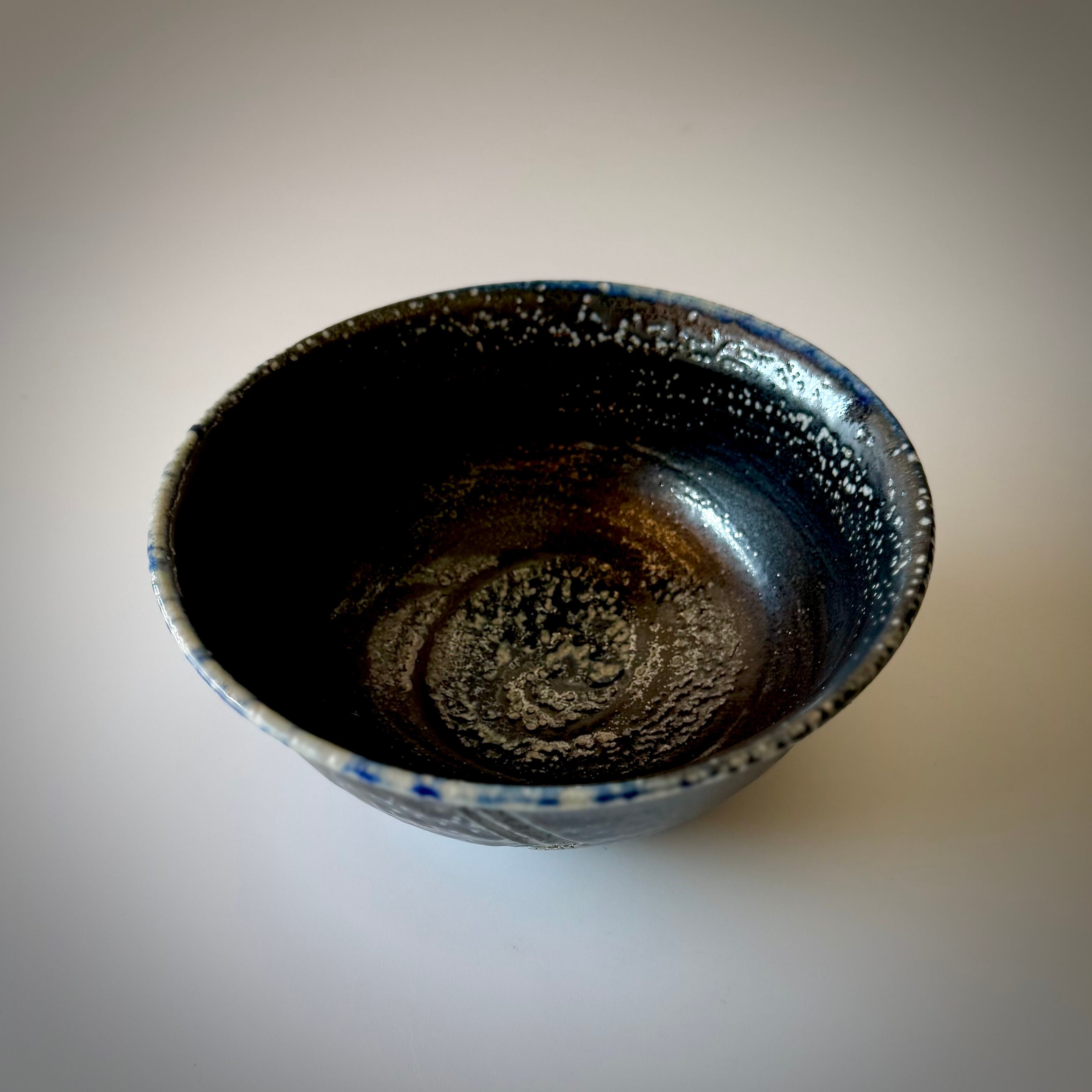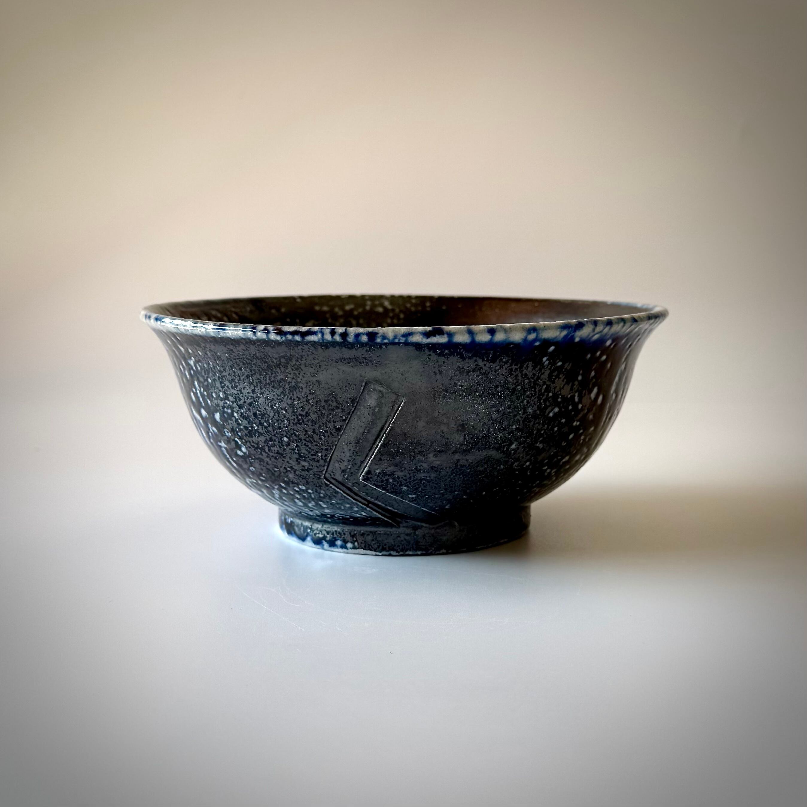 重曹を窯に直接投入して器面にソーダガラスを形成させるソーダ焼成。こちらの品はコバルトを含む呉須という顔料を塗り、そのまま窯に詰めたものです。炎がよく当たった外側はつややかな釉が生じて一部に明るい青、全体的に土味が残った黒が現れています。内側には刷毛目を施し黒の中に変化を狙いました。麺類用のどんぶりとしてはもちろん、黒が野菜の色を引き立てるのでサラダボウルとしても使い勝手が良いと思います。