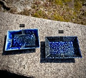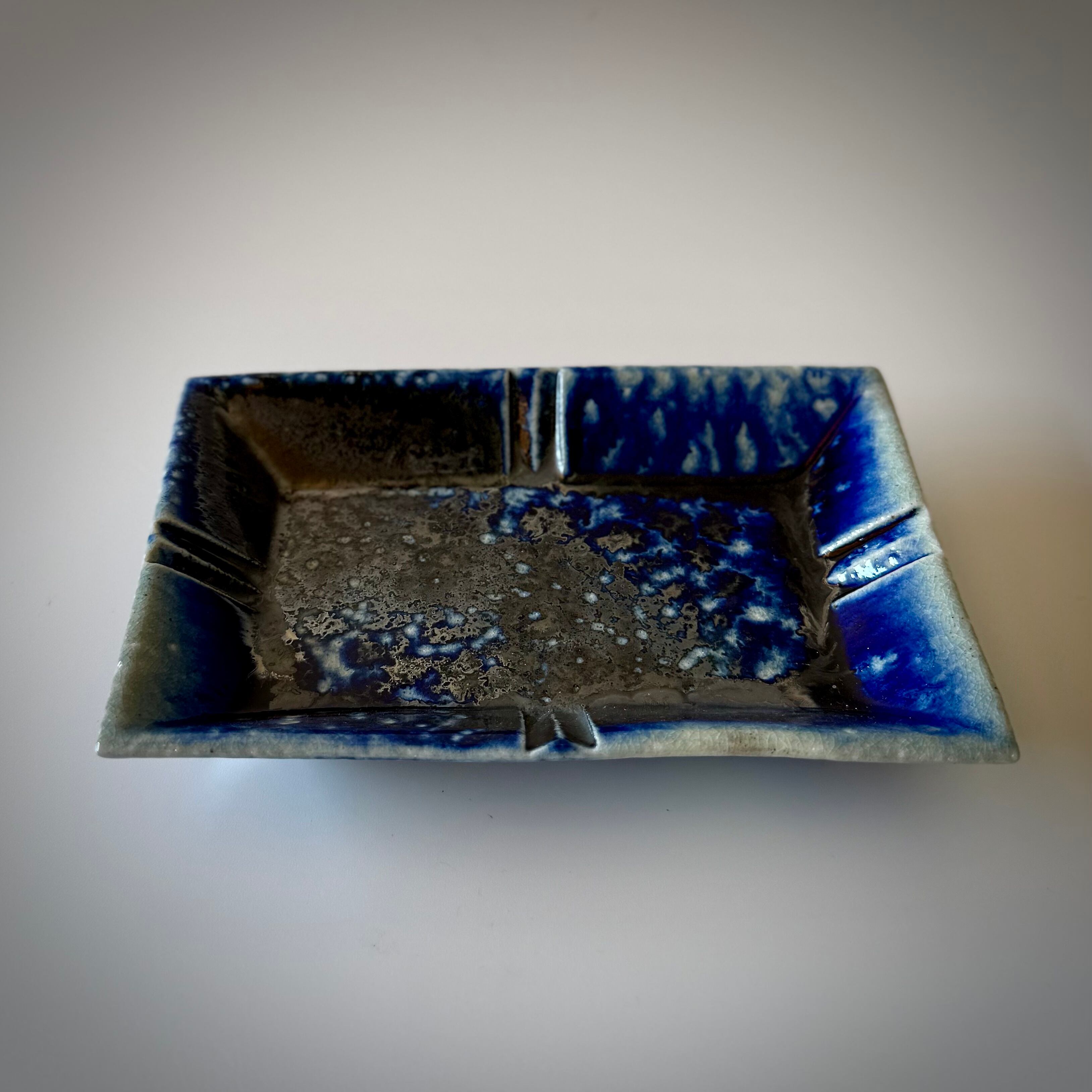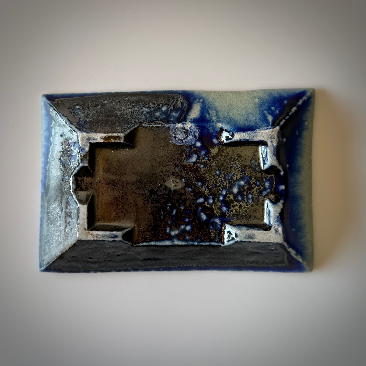 重曹を窯に直接投入して器面にソーダガラスを形成させるソーダ焼成。こちらの品はコバルトを含む呉須という顔料を塗り、そのまま窯に詰めたものです。炎がよく当たりつつ他の作品で影を作ることで艶やかな青と土味を残した黒、両方を一つの器に表すことに成功しました。1cmほどの高さの足をつけており、それが安定感を生むとともに食卓の中での料理映えを助けてくれます。