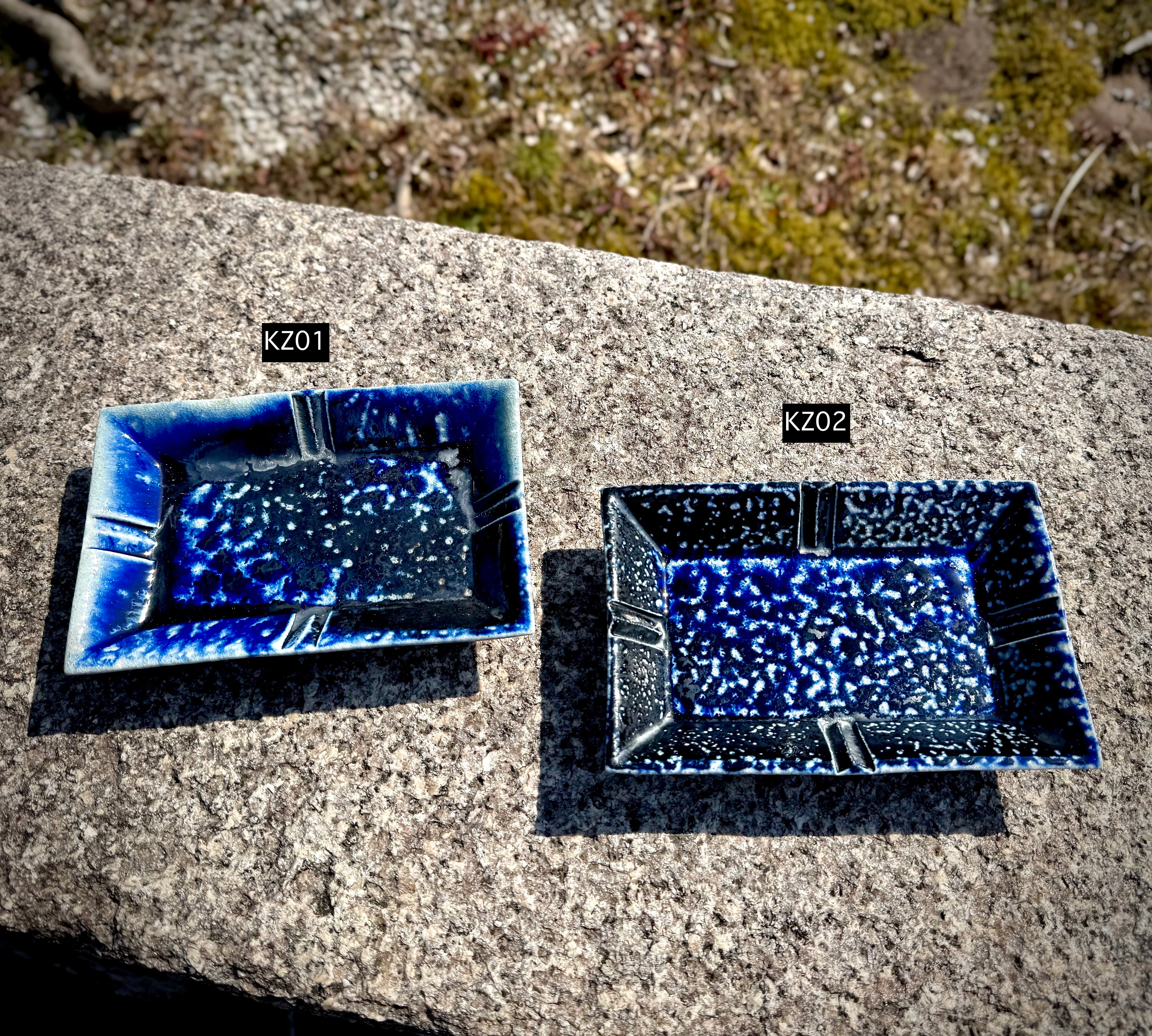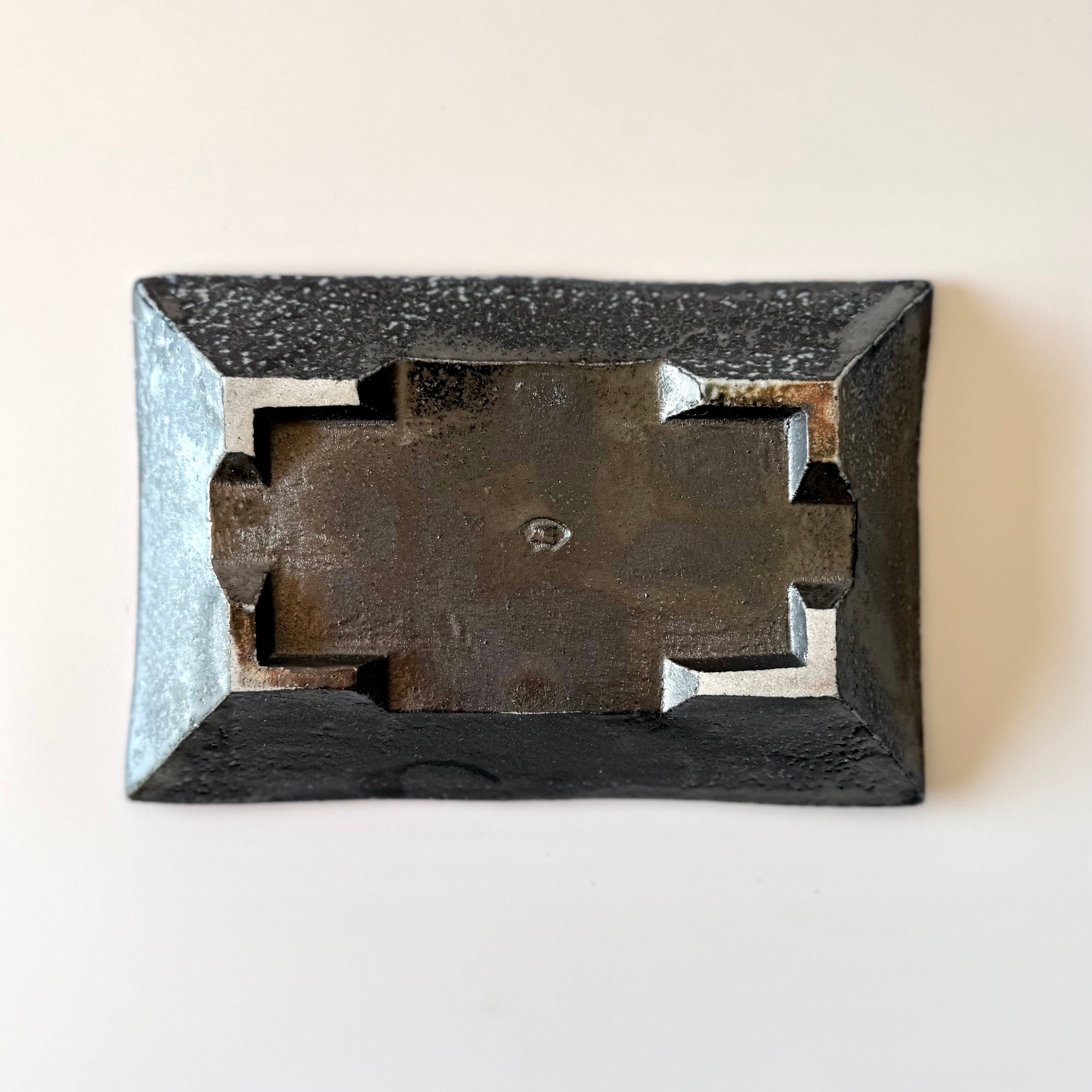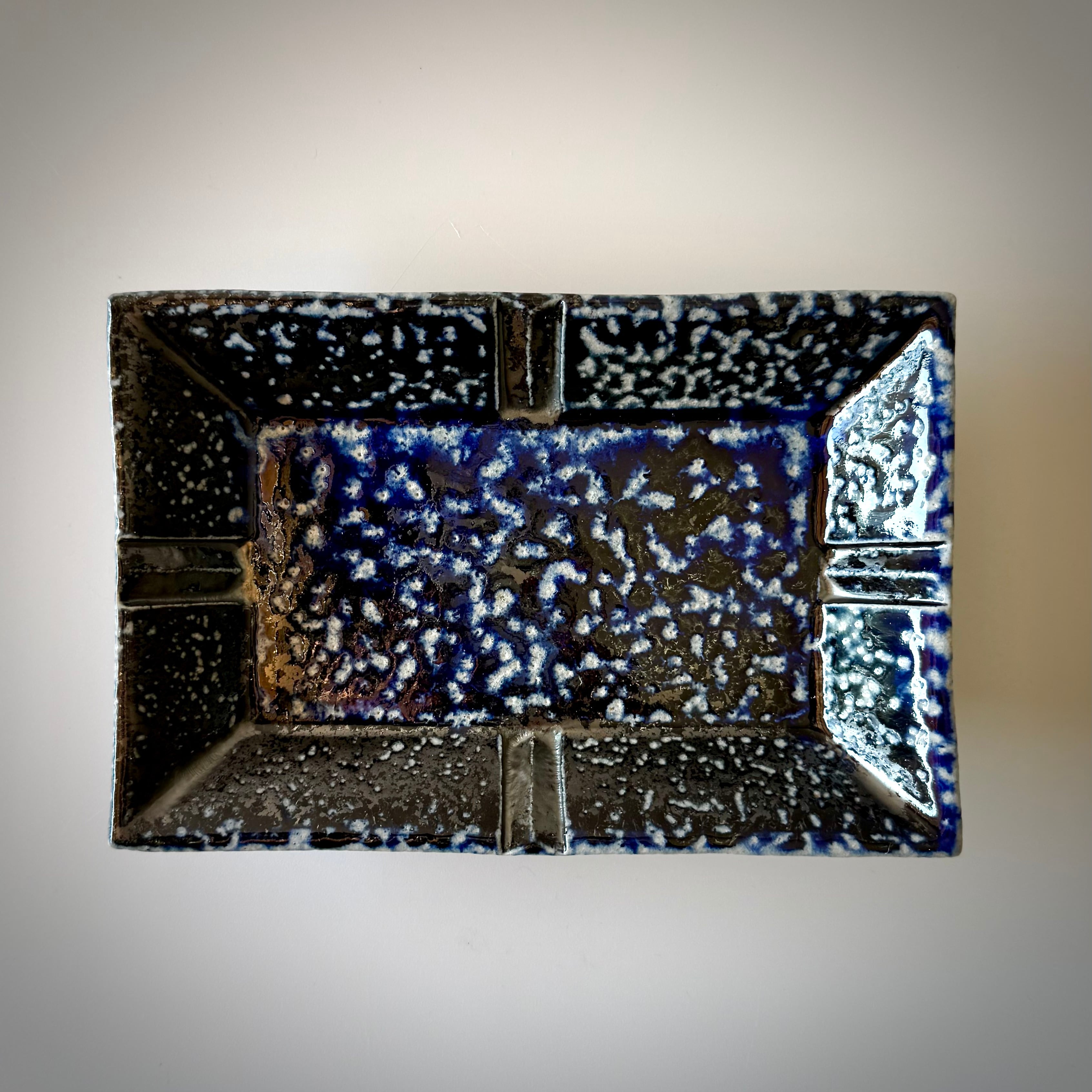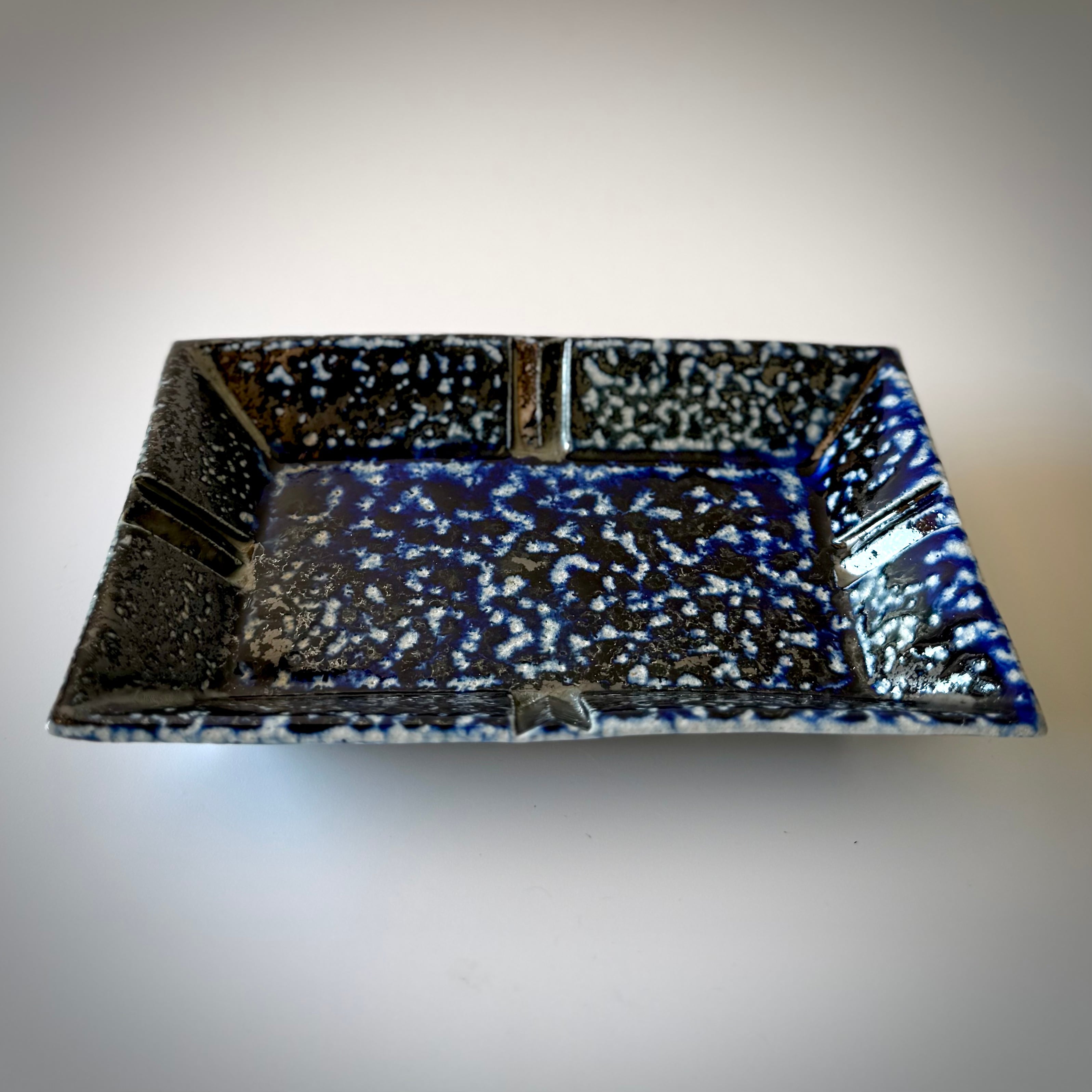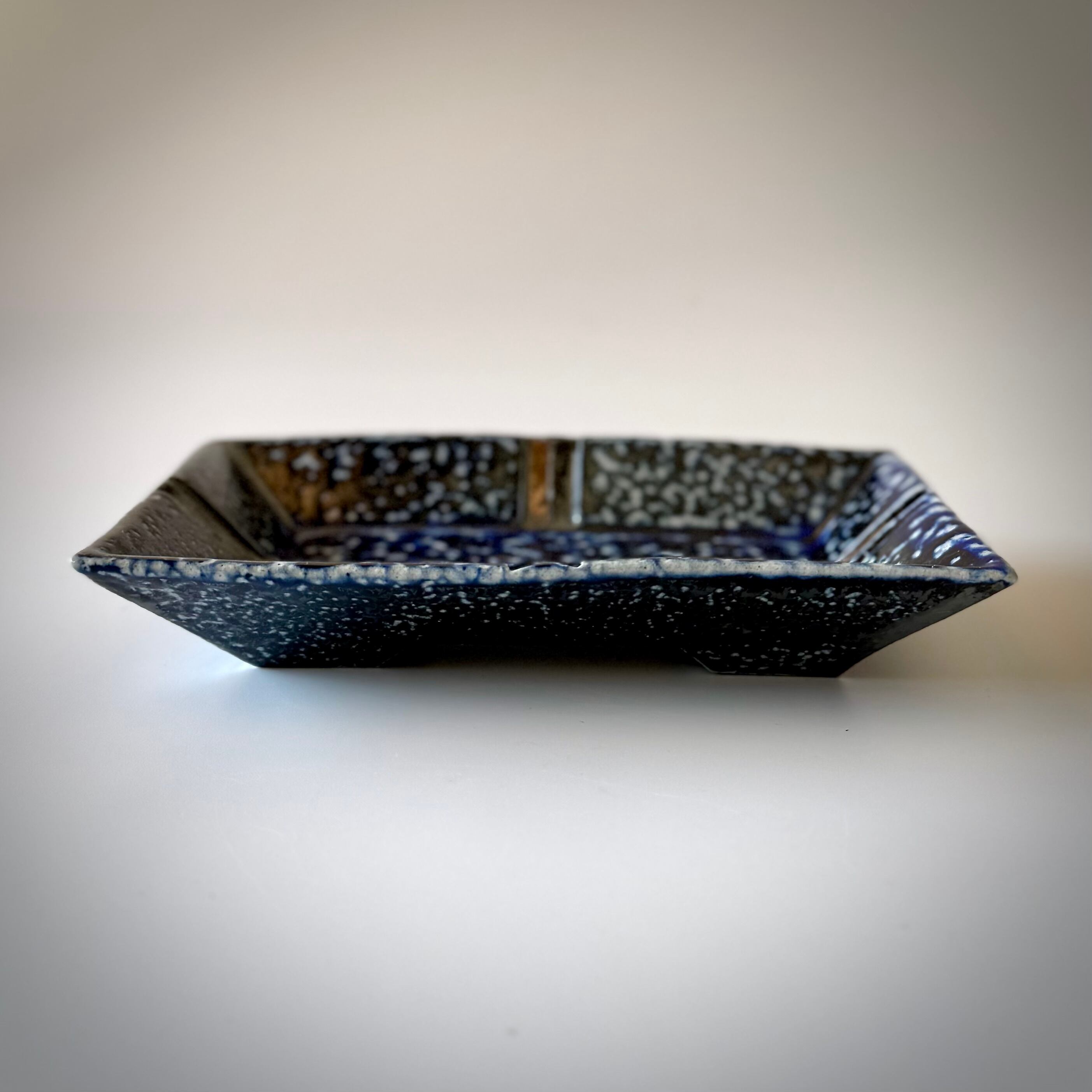 重曹を窯に直接投入して器面にソーダガラスを形成させるソーダ焼成。こちらの品はコバルトを含む呉須という顔料を塗り、そのまま窯に詰めたものです。器全体にソーダが降り積もったことでソーダの特徴である斑点が均一に現れました。1cmほどの高さの足をつけており、それが安定感を生むとともに食卓の中での料理映えを助けてくれます。